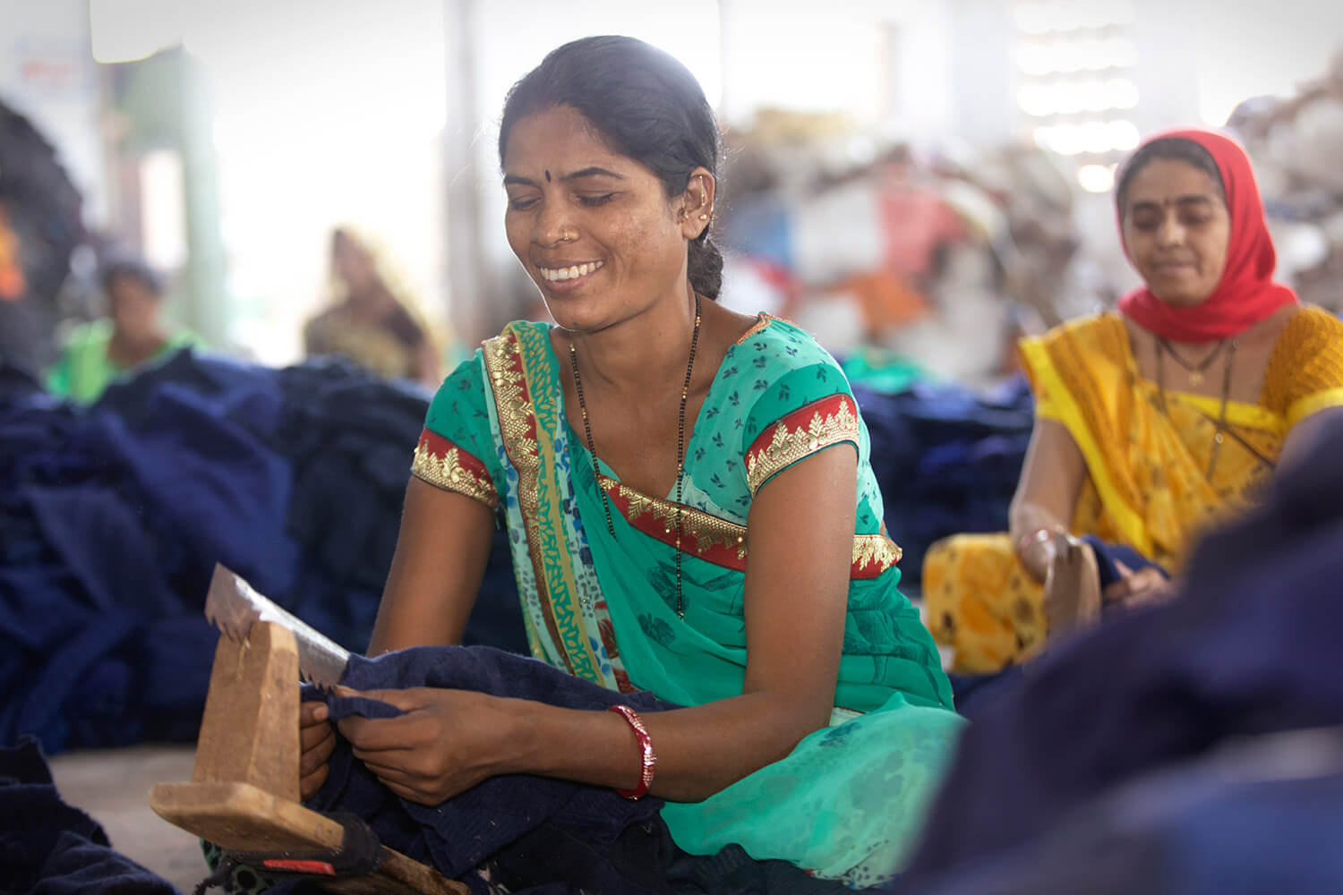 反毛された繊維は、紡績工程での強度を高めるために、再生ポリエステルとブレンドされます。