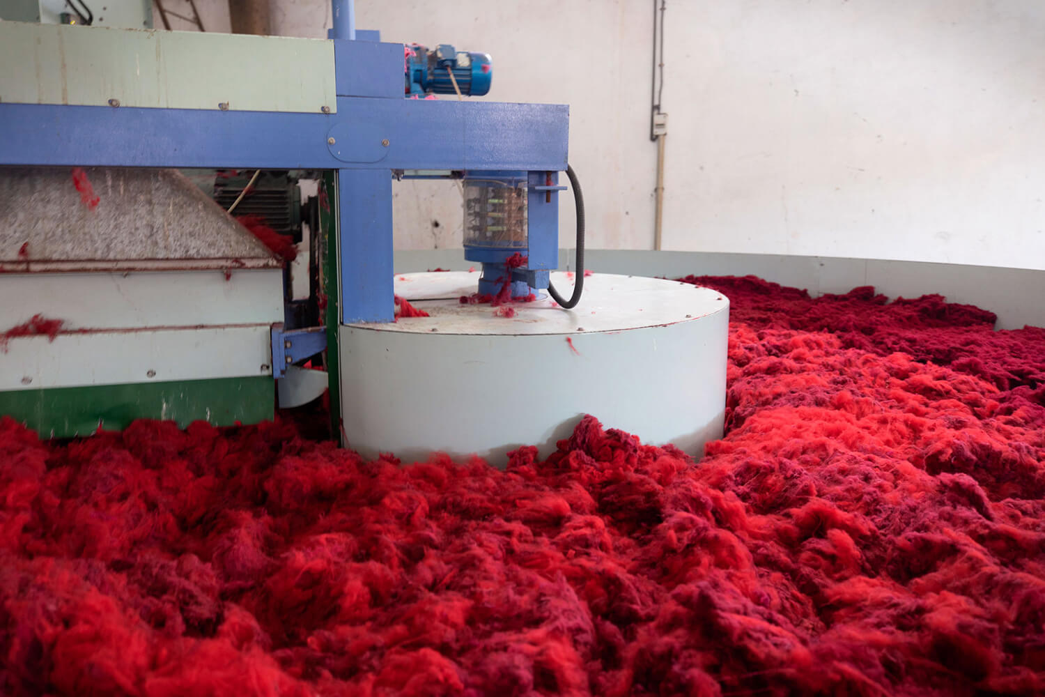 クリーニング工程では、ボタン、ジップ、 ラベル、その他すべての異物を衣類から取り除きます。その後、衣類は機械で散り散りに分解され、繊維に戻されていきます。