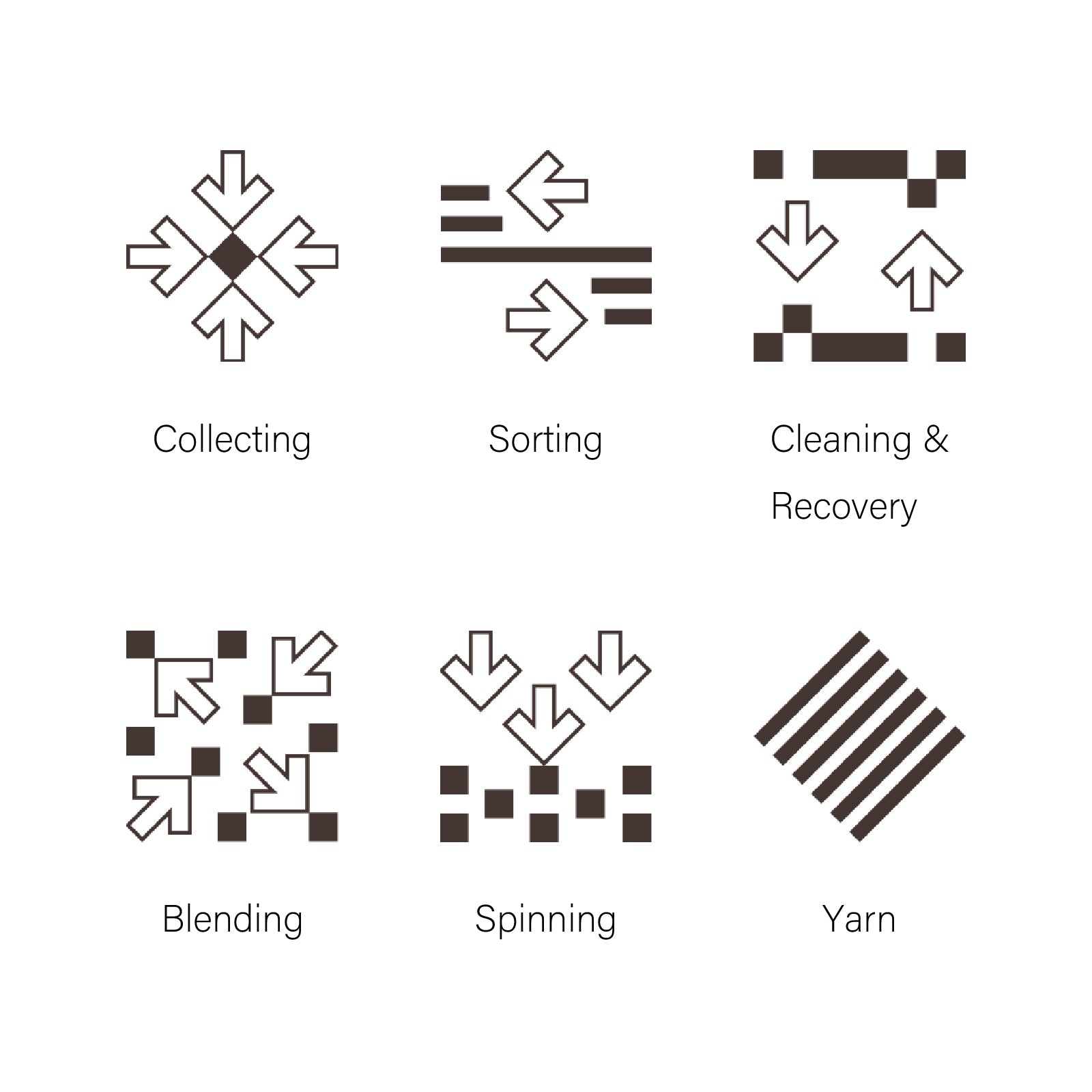 回収された繊維は、紡績工程での強度を高めるために、再生ポリエステルとブレンドされます。