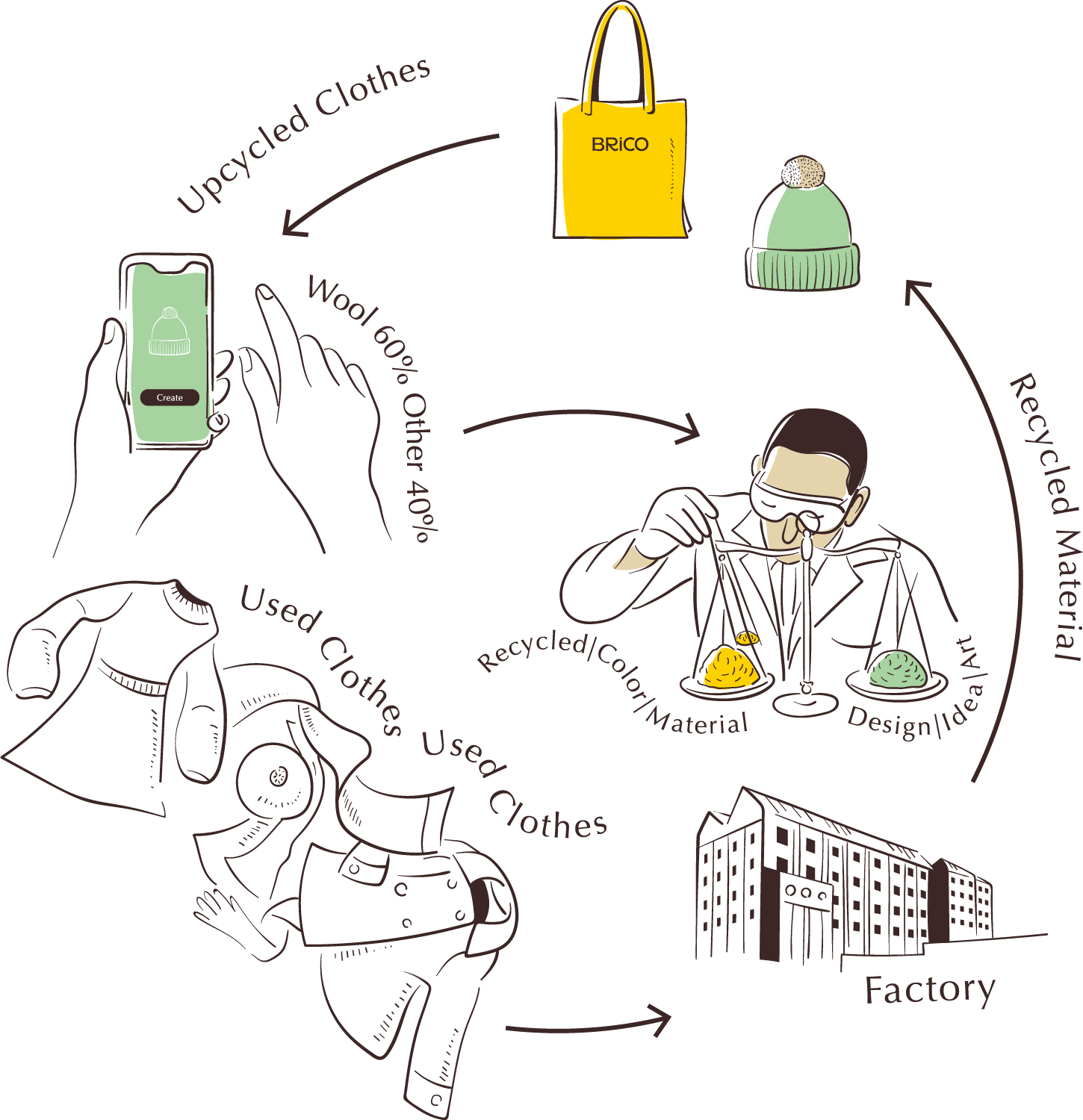 たとえば、古着を送ると、アプリを通して新しい服の購入オファーが届くーー。これはBRiCOの描く未来像のひとつです。BRiCOが追求するのは、古着が廃棄物ではなく、新しい服を買うためのチケットになる未来。そうして人々は新しいファッションカルチャーを楽しみながら、失われた地球の環境を修復する。BRiCOのアップサイクルは、そんな現代のサステナブルな「ブリコラージュ」の実現です。