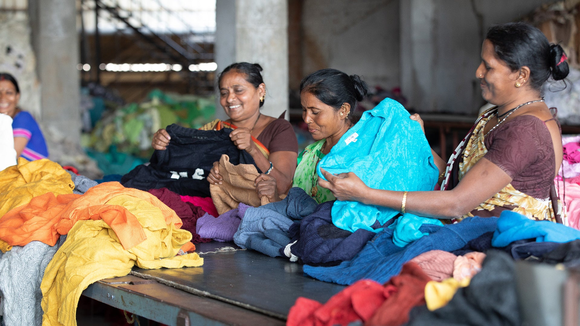 インドにあるBRiCOのファクトリーでは、選別とクリーニングの工程において、識字能力が乏しいために働くことができない近隣の集落の女性たちが雇用されています。ファクトリーではこうした女性を300人雇用しており、社会進出と生活向上を支援しています。BRiCOのアップサイクルには、地域の社会問題の改善も含まれているのです。