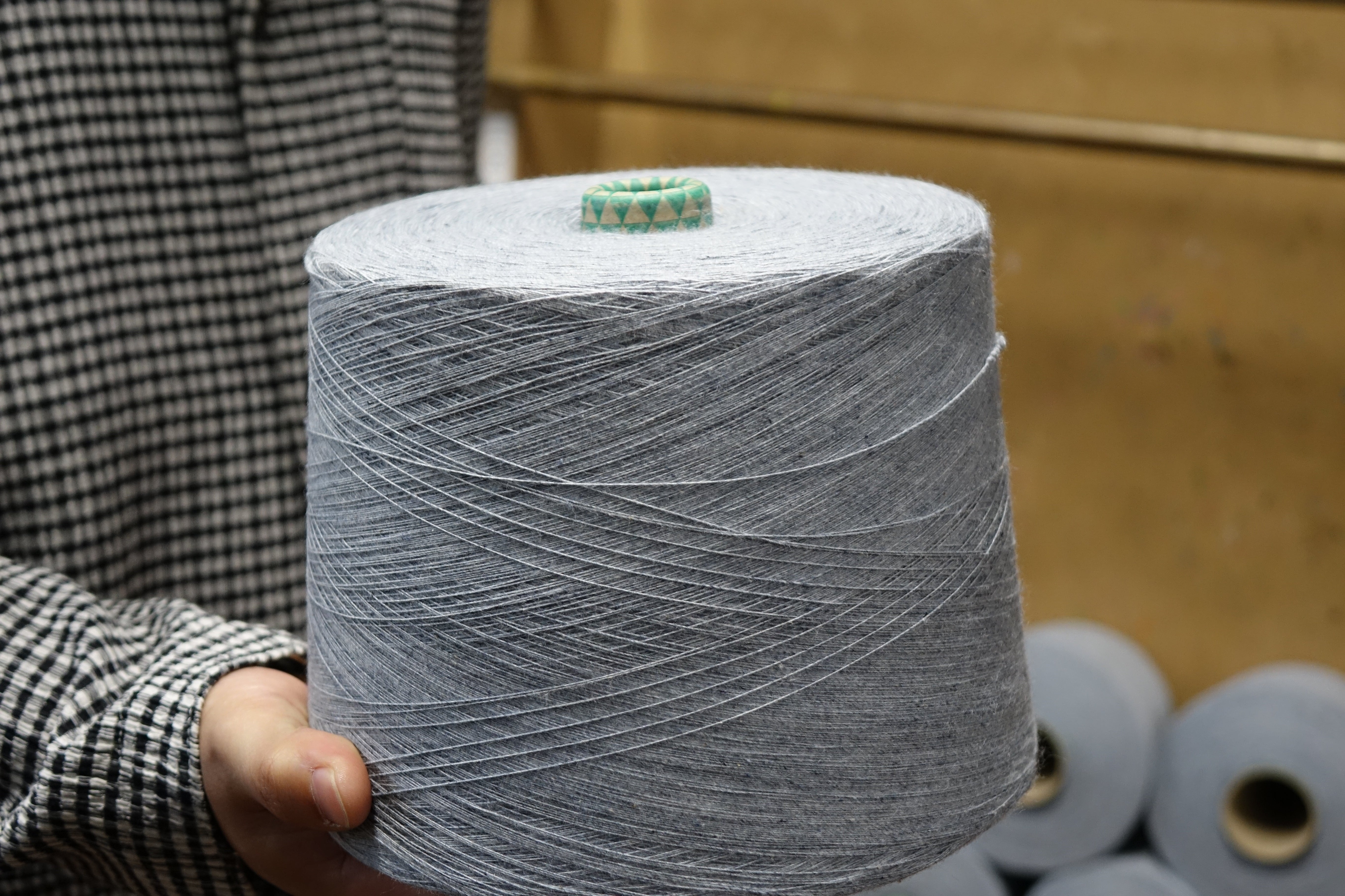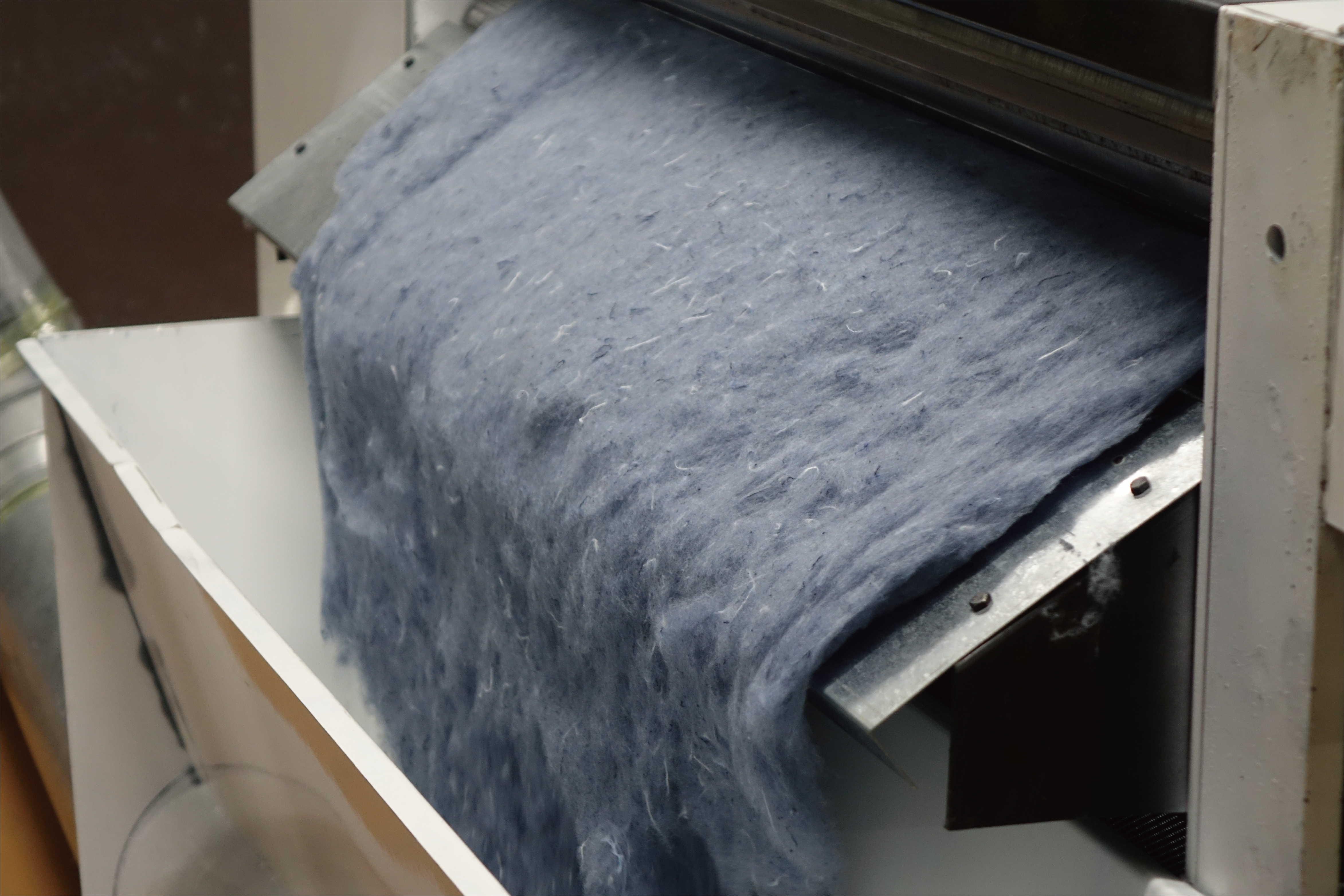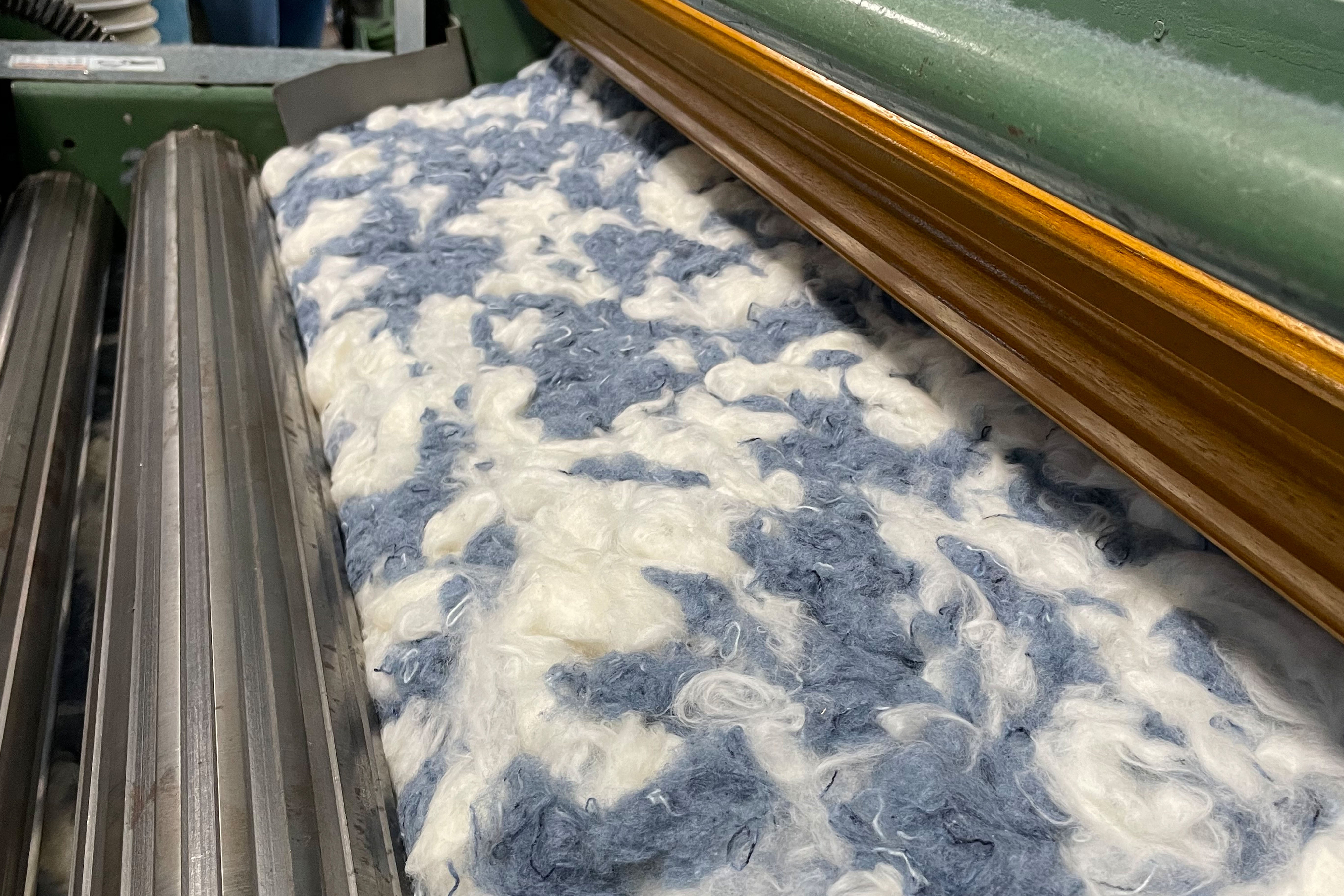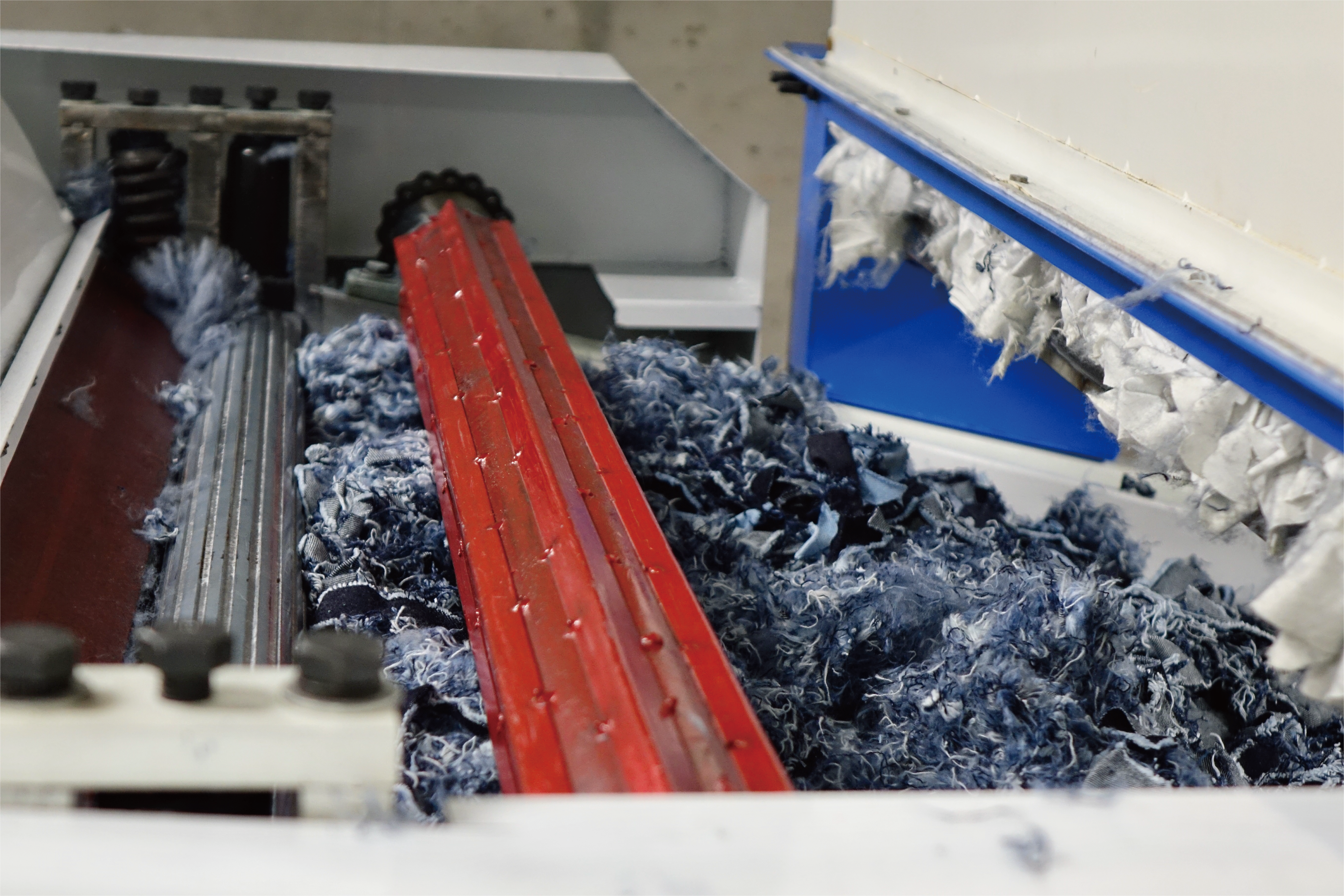デニム生地の裁断くずから反毛を経て糸にする工程