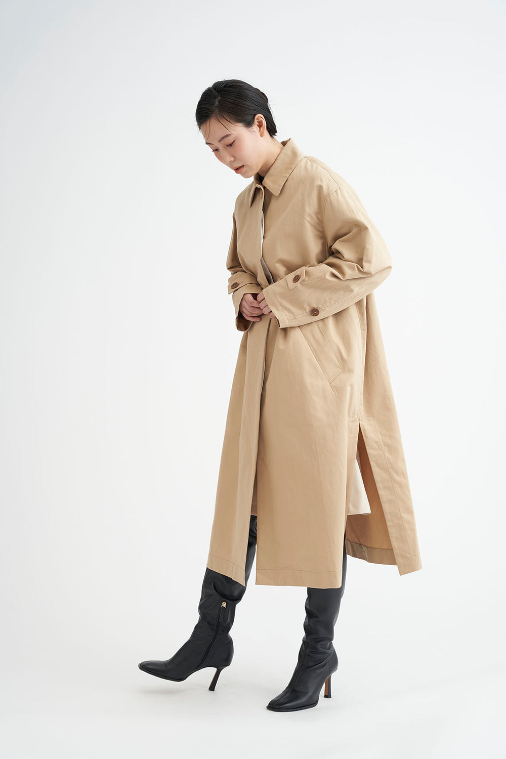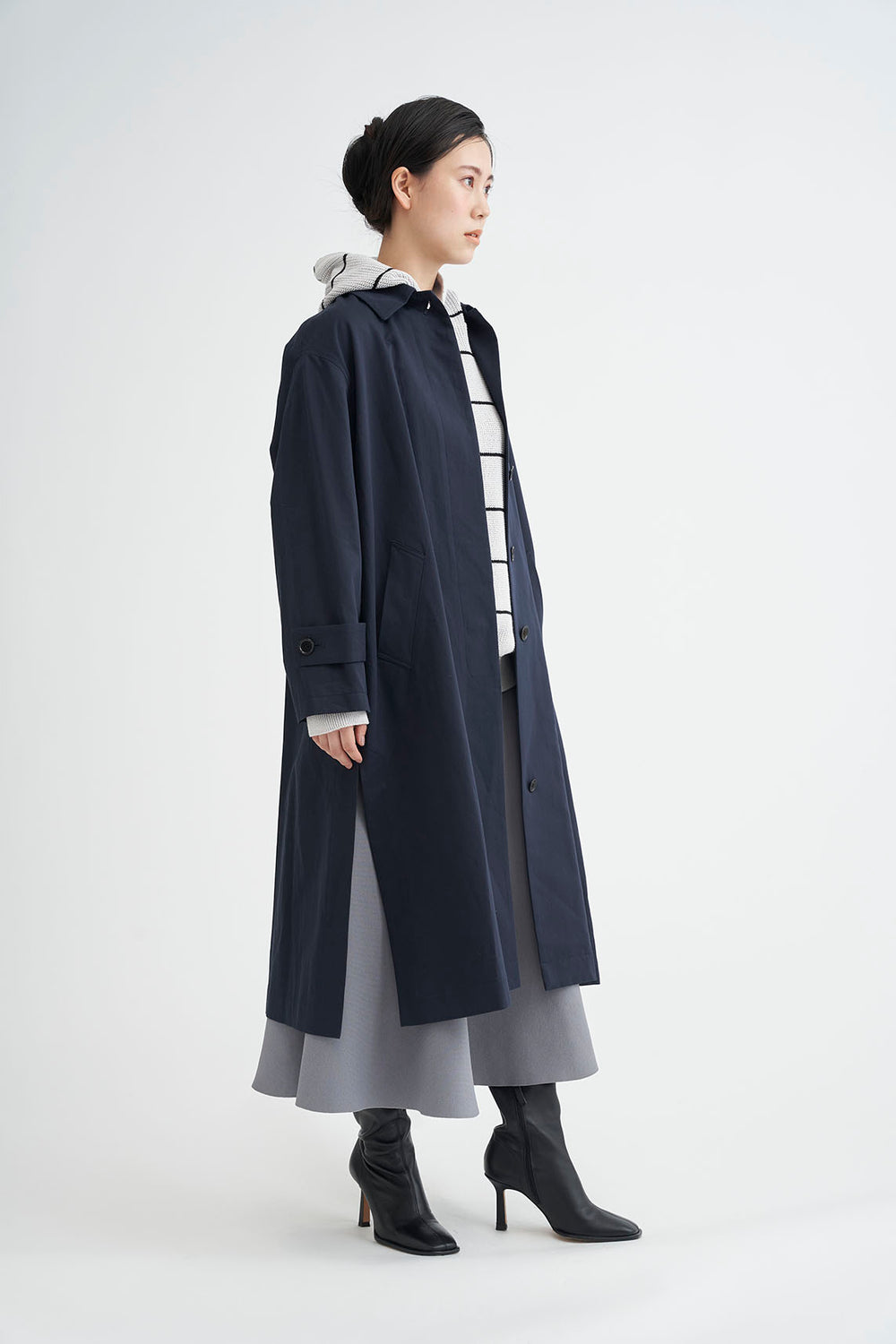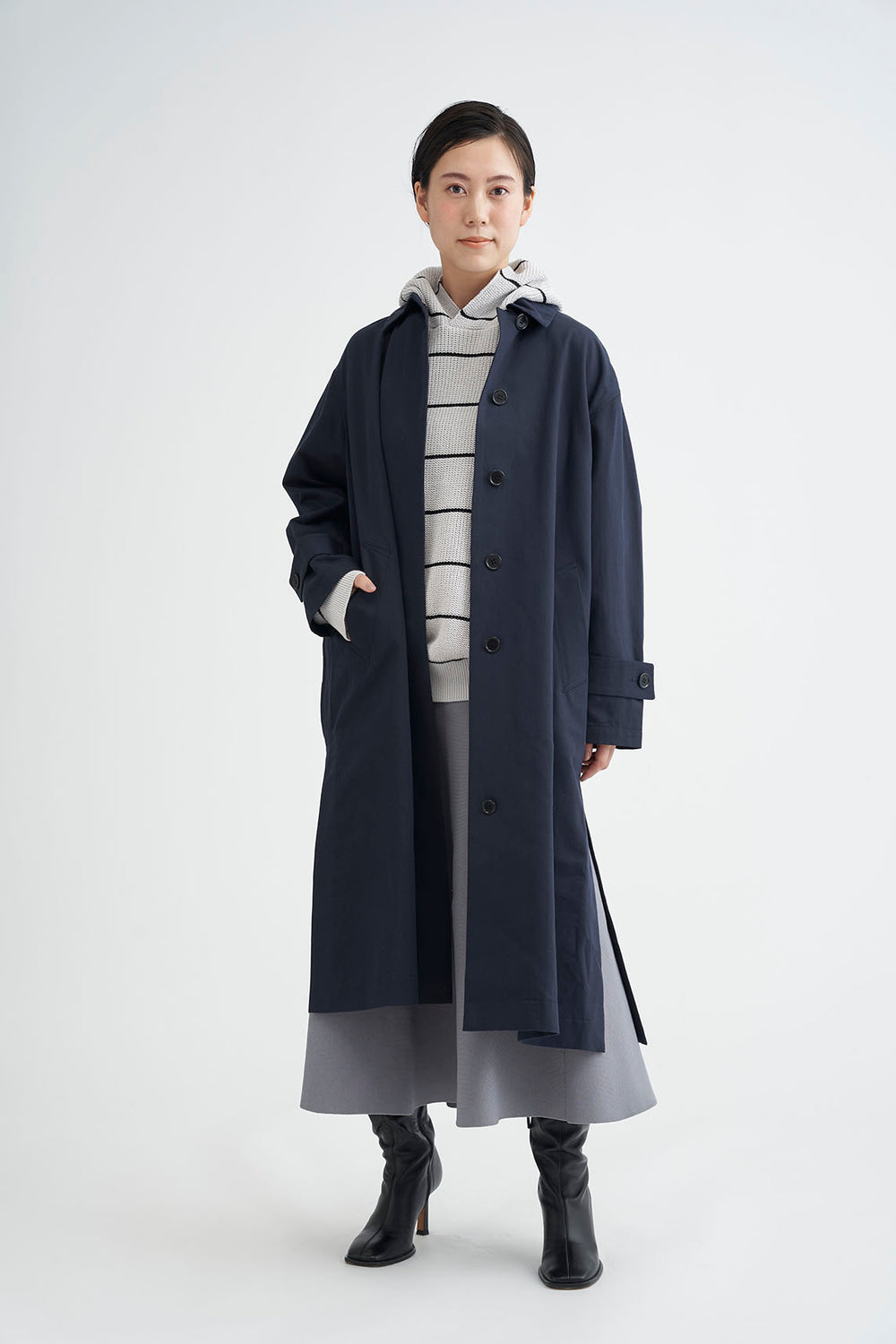 蒸れにくく軽い紙糸の良さを最大限引き出した、環境配慮型フッ素フリー撥水ステンカラーコート。