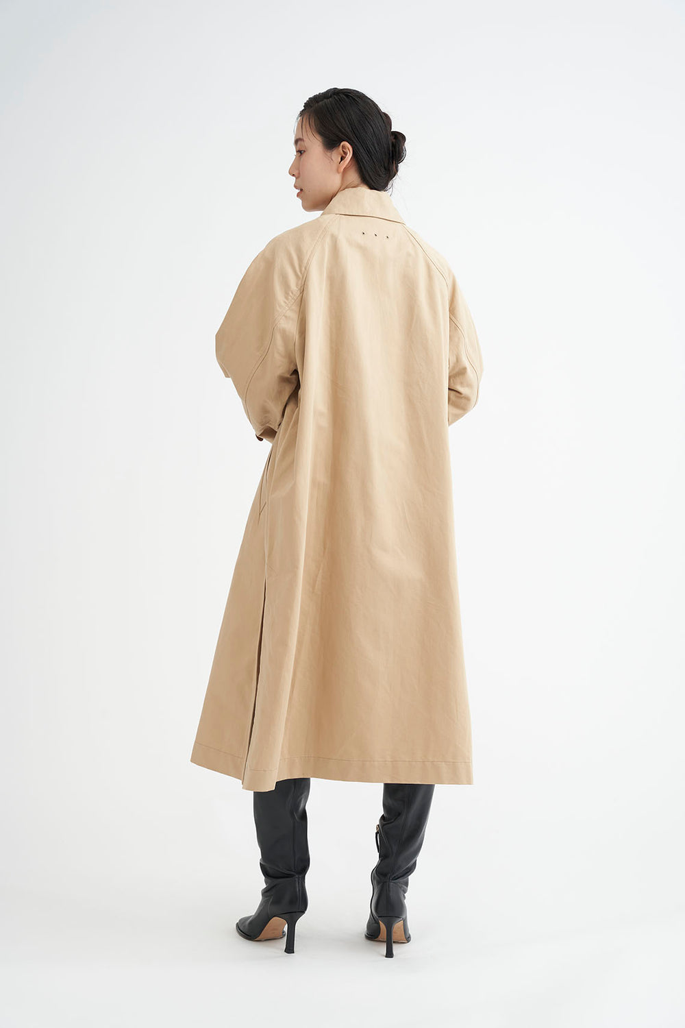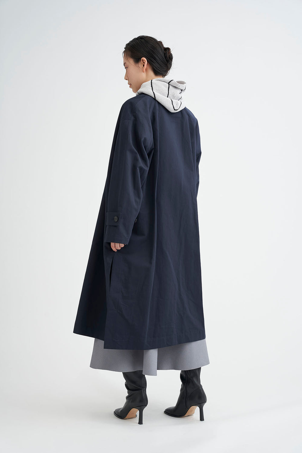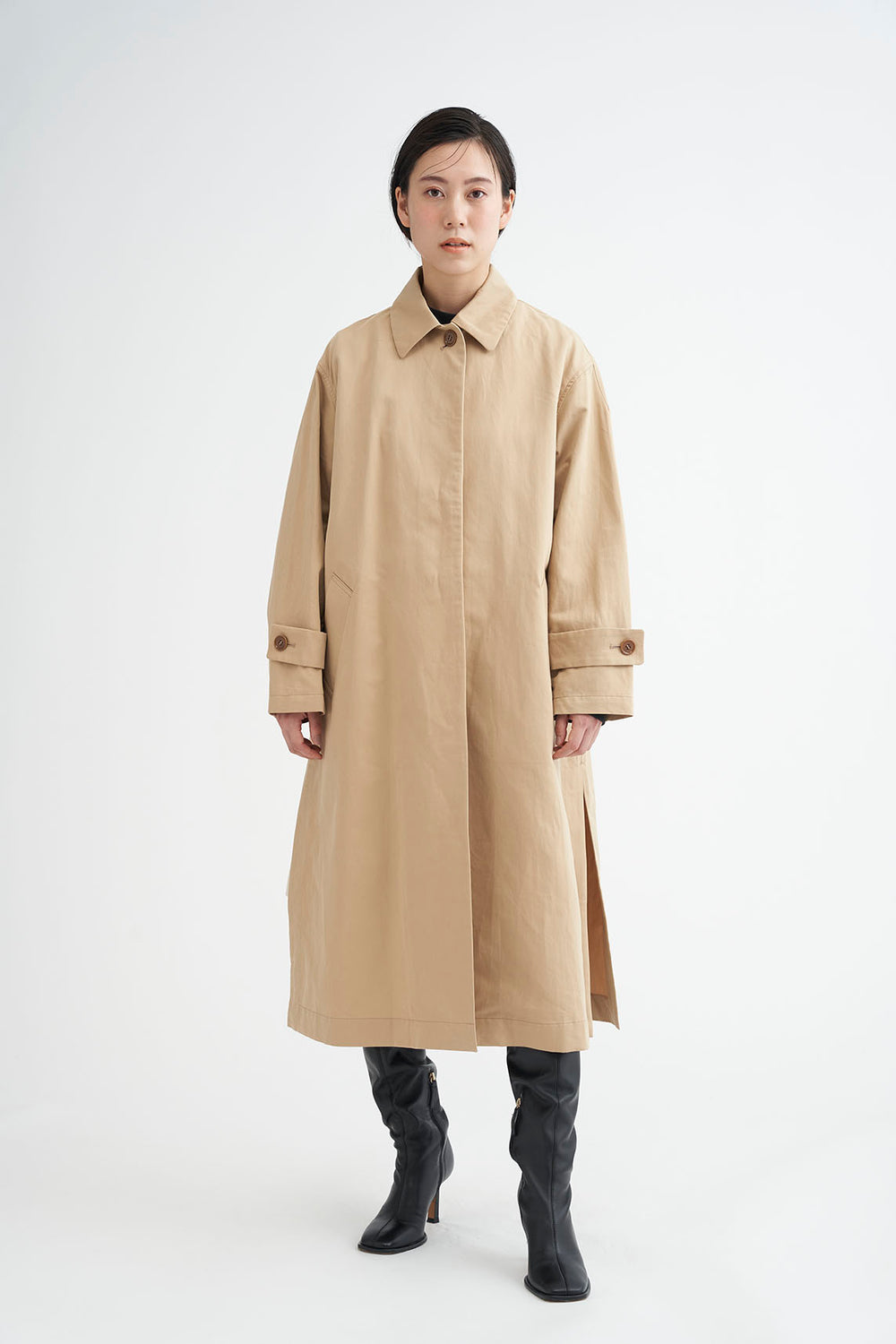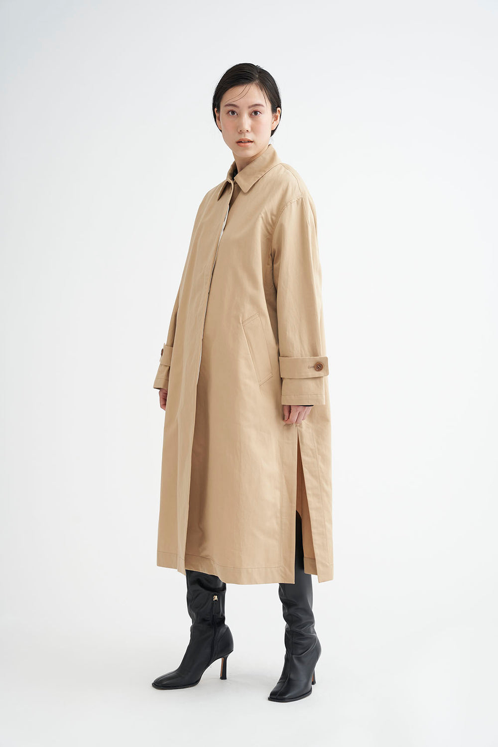 蒸れにくく軽い紙糸の良さを最大限引き出した、環境配慮型フッ素フリー撥水ステンカラーコート。